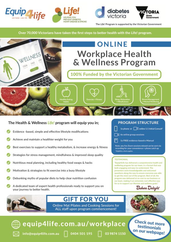 We cautiously signed up for the free Equip4Life program as it seemed ‘too good to be true’ – I had to ask 3 times to make sure there was no fine-print or strings attached. It was indeed free (Government-funded), and super-helpful – and with lovely presenters/instructors who are very up to date, and present on the latest medical research. Our team has loved the overall view covering all the fad diets/exercise regimes and bringing home the needed detail, and are all the better for being part of it. Thanks to the Equip4Life team!